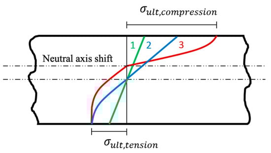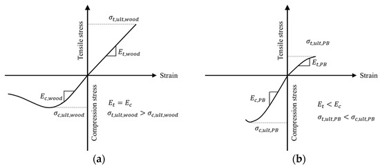 Mechanics models have primarily been created for modeling bending strength distributions of sawn timber. The ultimate strength of sawn timber (Figure 1a) is higher in tension than in compression [13,14]. The stress–strain relationship of sawn timber is linear in tension, whereas it behaves nonlinearly in compression, showing a decreasing trend after reaching its ultimate value. The differing mechanical response in tension and compression of sawn timber causes the neutral axis to shift toward the tensile side of the timber. In contrast, the ultimate tensile strength of PB materials is significantly lower than that of compressive strength (Figure 1b) [15,16].