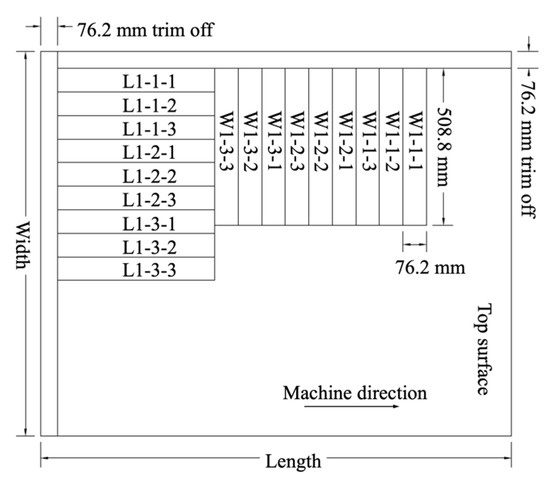 Figure 2 illustrates the cutting pattern, showing the locations from which all test PB strips were cut (ASTM D 1037, 2020 [22]). These strips were cut to dimensions of 508 mm in length and 76.2 mm in width. The strips cut with their lengths oriented along the width of a full-size panel were coded as W#-#-#, and those cut along machine direction (length direction) of the panel were coded as L#-#-#. In both coding systems, the first number # represented the sequence number of the panel selected, the second number # indicated the strip set, and the third number # denoted the replicate within that set. Nine strips in each of the two panel directions, width and length, were cut from each of five full-size PB panels. Three consecutive strips were grouped together as one set, for example, L#-3-1, L#-3-2, and L#-3-3 for a panel with the sequence number #, under the assumption that these three replicates shared similar physical and mechanical properties. Consequently, a total of ninety bending strips, comprising thirty sets, were prepared.