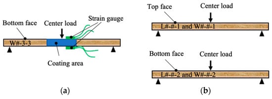 For the validation of mechanics model, bending tests were conducted by using a complete 2 × 2 factorial experiment design, considering two factors that affect the ultimate bending moment of PB. The factors included the center-loading direction (top or bottom face of a test strip) and strip orientation (lengthwise along the panel’s width or crosswise along the panel’s length). Fifteen replicates were evaluated for each of four combinations. Specifically, in the combination of center-loading applied to the top face, three replicates coded with L#-#-1 and three replicates coded with W#-#-1 were selected from a full-size panel (Figure 3b top). The same selection method (three replicates coded with L#-#-2 and three replicates coded with W#-#-2) was used for the combination with center-loading applied to the bottom face (Figure 3b bottom). Therefore, a total of 60 replicates were evaluated.