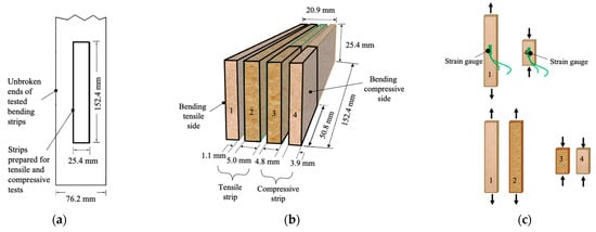 Five rectangular strips, each measuring 152.4 mm long by 25.4 mm wide (Figure 4a), were first cut off from the unbroken ends of strips used in the mechanics model development group, while sixty other rectangular strips were cut from those used in the validation group. After slicing the strips into four layers along their length direction, the layers were labeled as layer 1, layer 2, layer 3, and layer 4, in the order from the tensile side to the compression side when subjected to the center-loading in bending (Figure 4b). Approximately 1.1 mm of material was lost due to the band saw kerf. Layers 1 and 4 had an average thickness of 3.9 mm, while layer 3 averaged 4.8 mm in thickness and layer 2 averaged 5.0 mm in thickness. Layers 1 and 2 were 152.4 mm long by 25.4 mm wide with their corresponding thickness, whereas layers 3 and 4 were 50.8 mm long by 25.4 mm wide with their respective thickness. Therefore, five replicates were tested for each combination of face layer and stress type during the mechanics model development group (Figure 4c, top), and 60 replicates were tested for each combination of face and core layers and stress type during the mechanics model validation group (Figure 4c bottom). In model development tests, layer 1 for the tensile test and layer 4 for the compressive test were affixed with a strain gauge to measure the pure tensile and compressive strains, respectively.