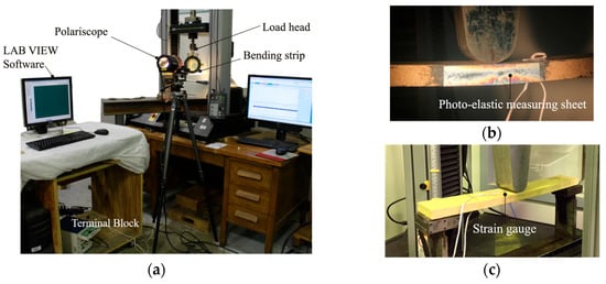 The bending load was applied to the midpoint of a 457.2 mm span with a speed of 0.15 mm/s. The shift in the neutral axis on the lateral section of each test PB strip was observed using the photo-elastic method through a Basic Reflection Polariscope (Model 031, Vishay Measurements Group, Raleigh, NC, USA) (Figure 5a). A photo-elastic measuring sheet, 127 mm long by 20.6 mm wide (PS-1 flat sheets, Vishay Measurements Group, Raleigh, NC, USA), was centered and glued to the lateral section of each of the five testing PB strips (Figure 5b) using PC-10 adhesive (Vishay Measurements Group, Raleigh, NC, USA). The Polariscope was set up with the polarizer/analyzer axes aligned with the principal axes of each PB strip. The compensator ring was set at zero and the neutral axis shifting was recorded using a video camera. The strain gauges (KFGS-5-350-C1-11, KYOWA Americans Inc., Novi, MI, USA) were mounted in pairs on the top and bottom of each of five strips using CC-35 adhesive (KYOWA Americans Inc., Novi, MI, USA) in the model development group. Each of the strain gauges was placed with its center 12.7 mm away from the midpoint of a test PB strip (Figure 5c). The tensile and compressive strains at the surfaces were recorded using the LabVIEW software (version 2018) (National Instruments, Austin, TX, USA).