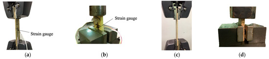 Figure 6 shows the setups for performing tensile and compressive tests in the model development group (Figure 6a,b) and the validation group (Figure 6c,d), respectively. The loading speed for the tensile tests was 0.06 mm/s, and for the compressive tests, it was 0.009 mm/s. A strain gauge (KFGS-5-350-C1-11, KYOWA Americans Inc., Novi, MI, USA) was attached to the center of each tensile or compressive strip tested in the model development group to measure its longitudinal strain under tensile or compressive loading. The measured strain was recorded using the LabVIEW software (National Instruments, Austin, TX, USA).