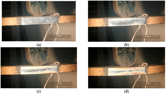 It was observed that the coated section on the thickness side of a testing PB strip appeared in silver color at the beginning when center-load bending was applied (Figure 8a). As the load increased, a black, wide color band (indicating zero stress) appeared below the centerline of the thickness of the testing PB strip and gradually became narrower, forming the neutral axis that moved up towards the centerline. As the load was further increased, an orange-and-blue color band started to appear at the bottom edge of the testing PB strip, which was in tension. On average, when the load reached one-third of its ultimate bending load, the neutral axis reached the centerline position of the testing PB strip (Figure 8b). As the load kept increasing, for instance, to two-thirds of the ultimate load, the neutral axis passed the centerline and shifted towards the compressive surface of the testing PB strip (Figure 8c). The neutral axis movement could be explained by the fact that the stiffness of a PB strip when loaded in compression was higher than when in tension (Table 1). As the load continued to increase to its ultimate value, the color bands spread throughout the parts on both the tensile and compressive sides, but the band on the tensile side was wider than the one on the compressive side (Figure 8d).