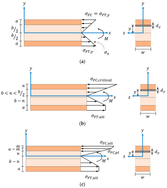 This study developed mechanics models to predict the bending moment resistance of four-layered PBs under simply supported center-loading conditions. The models account for elastic–plastic and bi-modular behaviors of PB during bending and predict the capacity at different loading stages. The general assumption for the stress distribution in a rectangular PB cross-section under simply supported center-loading involves three stages in the bending moment development process (Figure 10).