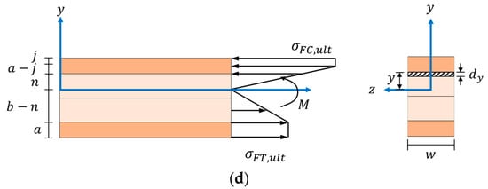 Figure 11d is the partially plastic model (Model 4) proposed for deriving of formulas to predict the bending moment capacity at ultimate point, in addition to the stepped elastic–partially plastic model (Figure 11c). The assumption is that the stress on the cross-section of a test PB strip is in Stage 3, where the face layer material on the compressive side is partially yielded, and the yielded section with a thickness of mm reaches its ultimate compressive strength. The value of could range from zero to = 4.1 mm. On the tensile side, the face layer material is fully yielded and reaches its ultimate tensile strength. Meanwhile, the neutral axis shifts towards to the compressive side. Therefore, applying expression (2) with specific stresses and geometries provided in Figure 11d yields the following:
