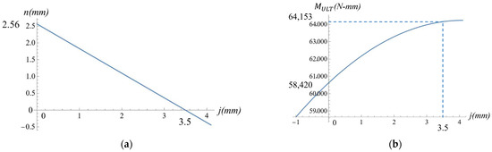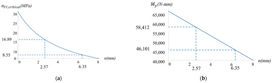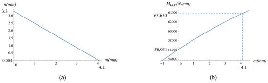 Combining Equation (8) with Formula (9) to eliminate the variable , and substituting the known material geometries and mechanical properties into the combined equation, yields the functional relationship between and , as plotted in Figure 14b. The maximum and minimum predicted bending moment capacities are 64,153 N-mm and 58,420 N-mm, respectively, which can be obtained by setting = 3.5 mm and = 0 mm.