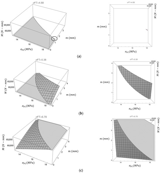 3D plot of the face tensile and compressive strength with corresponding bending moment (gray grid area), perspective view and front view. (a) Face layer tensile strength is 4.88 MPa. (b) Face layer tensile strength is 5.38 MPa. (c) Face layer tensile strength is 6.78 MPa.