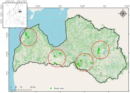 The research was conducted in Latvia, located within the hemiboreal forest zone of the Eastern Baltic region [48]. The climate is characterized as humid continental [49], with a mean annual air temperature of 6.8 °C and an average annual precipitation of 685.6 mm [50]. Study sites were selected across the country at four locations, with nine forest stands chosen at each location (Figure 1). The selection was stratified based on the presence of DNM, stand age (representing the rotation interval of commercial stands), and composition (stands formed by the main economically important species). Accordingly, the dominant species of the stands were Scots pine, Norway spruce, and silver birch, where they comprised at least 60% of the canopy layer (by basal area). DNM was conducted primarily in 2012 (29 stands), while in the remaining seven stands, DNM was carried out in either 2006 or 2010. The study sites were selected to ensure that no commercial thinning or other forestry operations had occurred during the ten years preceding DNM.