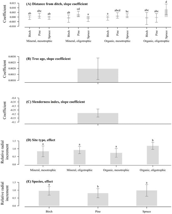 Tree species and age, site type, distance from the drainage ditch, and slenderness index effects (gray bars) on relative radial increment after DNM (Bars sharing the same lowercase letter are not significantly different at α = 0.05).
