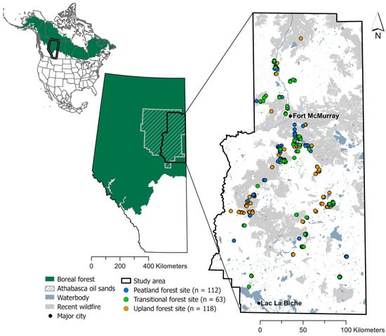 Sites sampled between 2017 and 2022 across the Athabasca oil sands region of Alberta, Canada, within the North American boreal forest. Study sites symbolized by ecosite and wildfires that recently burned (within 25 years of sampling) are shown.