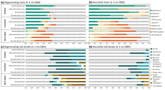 Tree species accounted for 68%–97% of recruited trees and tall shrubs in peatland forests, 49%–69% of recruited trees and tall shrubs in transitional forests, and 63%–87% of recruited trees and tall shrubs in mesic upland forests (Figure 2b). Among disturbance types within each forest type, unburned seismic lines had the lowest abundances of recruited trees (49%–68%; Figure 2b). Black spruce (17%–76%) and tamarack (17%–32%) were the most abundant recruited tree species in peatland forests, though disturbed peatlands had higher abundances of recruited jack pine (11%–28%) and recruited paper birch (3%–19%; Figure 2b). In transitional forests, recruited black spruce was most abundant in undisturbed forests (57%), recruited paper birch was most abundant in unburned seismic lines (20%), recruited trembling aspen was most abundant in burned forests (20%), and recruited jack pine was most abundant in burned seismic lines (25%; Figure 2b). In mesic upland forests, trembling aspen was the most abundant recruited tree across all disturbances (21%–66%), except in unburned seismic lines, which had a higher abundance of recruited paper birch (26% compared to 21%; Figure 2b). Undisturbed mesic upland forests had relatively higher abundances of recruited white spruce (25%), although they did not exceed recruited trembling aspen abundance (35%; Figure 2b). Recruited willow was the most abundant tall shrub in peatland forests while in transitional forests recruited willow (11– 32%) and recruited river alder (8%–19%) were both abundant tall shrub species across all disturbance types (Figure 2d). In mesic upland forests, green alder was the most abundant recruited tall shrub in undisturbed forests (15%), unburned seismic lines (21%), burned forests (6%). Both recruited green alder (9%) and willow (10%) were relatively abundant in burned seismic lines in mesic upland forests (Figure 2d).