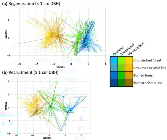We compared the composition of abundant tree and tall shrub regeneration and recruitment using ordinations with stress values for the ordinations between 0.1 and 0.2, indicating fair representation of dissimilarities among forest communities [41]. Composition of regenerating trees and tall shrubs was most similar within forest types and more similar between transitional and peatland forests (Figure 3a), supporting that nutrient and moisture gradients strongly influenced regeneration patterns. Conversely, in tree and tall shrub recruitment disturbances seemed to have a stronger influence on composition. However, transitional forests were compositionally centralized between peatland and mesic upland forests (Figure 3b). In peatland and transitional forests, undisturbed forests were most dissimilar to disturbed sites, likely due to undisturbed forests having more mature trees, as we did not use an upper diameter limit for recruitment. Unburned seismic lines in mesic uplands and transitional forests were also relatively dissimilar in recruitment composition to other disturbances and undisturbed forests, perhaps due to higher abundances of tall shrubs (Figure 2d and Figure 3b). Burned forests and burned seismic lines were the most similar in all forest types (Figure 3b), suggesting a dominant effect of wildfire on species composition recruitment.