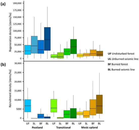 Among disturbance types in peatland forests, median regeneration density was highest in burned seismic lines (68,500 stems/ha) and lowest in undisturbed forests (28,667 stems/ha; Figure 4a; Table S1). Seismic lines in peatland forests had a median regeneration density of 46,500 stems/ha, more than the median regeneration density of 33,166 stems/ha in burned peatland forests (Figure 4a; Table S1). In transitional forests, median regeneration density was low in undisturbed forests (7500 stems/ha) and high in burned seismic lines, although burned transitional forests had a lower median regeneration density (27,667 stems/ha) than transitional unburned seismic lines (7666 stems/ha; Figure 4a; Table S1). In mesic upland forests, median regeneration density was low in undisturbed forests (12,333 stems/ha) and high in burned forests (18,000 stems/ha), while seismic lines and burned seismic line median regeneration densities were 15,000 stems/ha and 15,667 stems/ha, respectively (Figure 4a; Table S1).