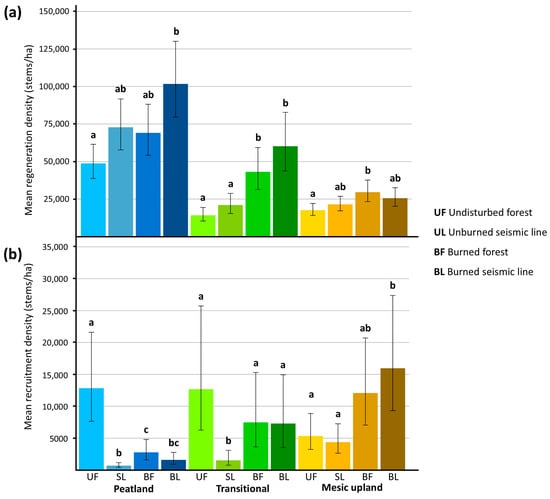 Estimated marginal mean densities and 95% confidence intervals of trees and tall shrubs on seismic lines and adjacent forests across boreal forest types. Letters indicate significant differences where 95% confidence intervals did not overlap among treatments. (a) Mean density of regenerating trees and tall shrubs (<1.3 m tall or <1 cm diameter at 1.3 m). (b) Mean density of recruited trees and tall shrubs (≥1 cm at 1.3 m).