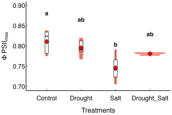 Changes in the maximum photochemical quantum yield (ΦPSIImax) under different treatments. Violin plots show the probability density distribution of data, with wider sections indicating higher data concentration (most pronounced in the Drought_Salt treatment). Boxplots inside violins display the interquartile range (IQR, 25th–75th percentile, white boxes), median line, and 1.5×IQR whiskers. Red diamond markers represent mean values of five replicates. Lowercase letters indicate statistically significant differences among treatments (p < 0.05, one-way ANOVA with Tukey’s HSD test).