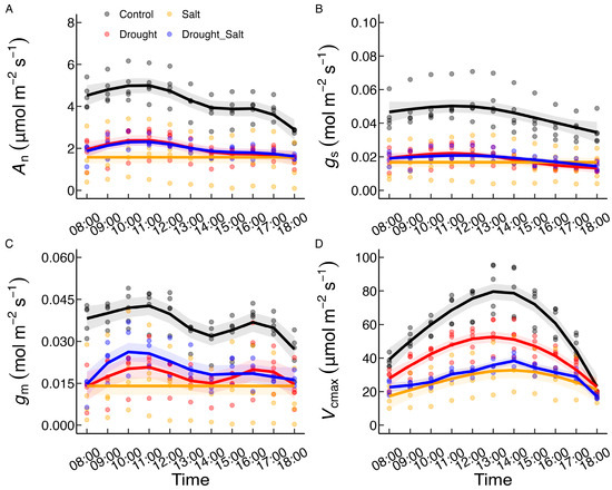 Diurnal variations in (A) the net photosynthetic rate (An), (B) stomatal conductance (gs), (C) mesophyll conductance (gm), and (D) maximum carboxylation rate (Vcmax) under different treatments. The data points display the measured values, while the line illustrates the fitted curve generated using the GAM approach, with the shaded ribbons indicating the 95% confidence intervals.