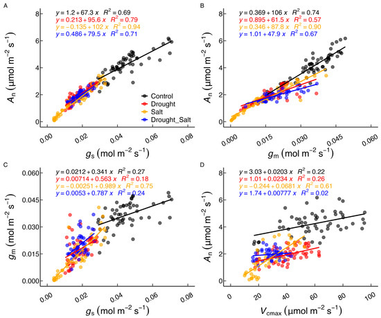 Correlations among photosynthetic traits under different treatments: (A) net photosynthetic rate (An) vs. stomatal conductance (gs); (B) An vs. mesophyll conductance (gm); (C) gm vs. gs; (D) An vs. maximum carboxylation rate (Vcmax). Different colors represent distinct treatment groups (see legend). Solid lines indicate linear regression fits, with regression equations and correction coefficients (R2) shown for each treatment.