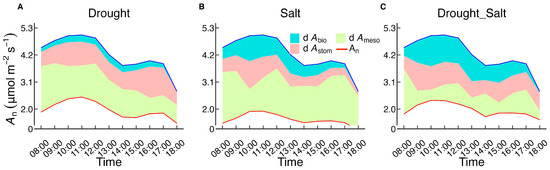 Quantitative diurnal analysis of photosynthetic limitations under (A) Drought, (B) Salt, and (C) combined Drought_Salt stress treatments. Stress-induced deviation in An (dAcal) relative to that of control plants was calculated at each time point and partitioned into biochemical (dAbio), mesophyll (dAmeso), and stomatal (dAstom) components.