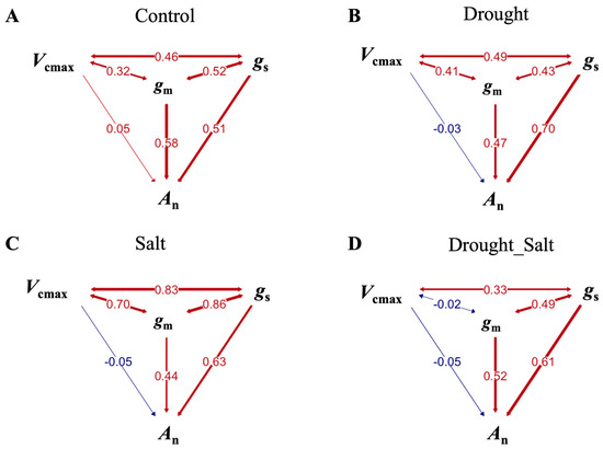 Standardized path coefficients obtained from structural equation modeling (SEM) analyzing photosynthetic traits under (A) Control, (B) Drought, (C) Salt, and (D) combined Drought_Salt treatments. Solid red arrows indicate positive relationships, while blue arrows represent negative relationships. Node labels include An (net photosynthetic rate), gs (stomatal conductance), gm (mesophyll conductance), and Vcmax (maximum carboxylation rate).