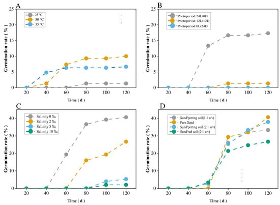 Temporal dynamics of germination rates of S. hydrophyllacea seeds under different environmental factors: (A) temperature; (B) photoperiod; (C) salinity; (D) soil substrate.