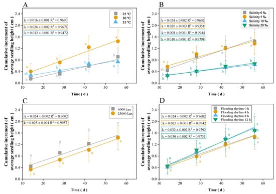 Cumulative mean height increment of S. hydrophyllacea seedlings over time: (A) temperature; (B) salinity; (C) light intensity; (D) flooding rhythm. Different lowercase letters indicate significant differences among treatments within the same period (p < 0.05).