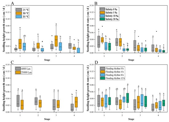 Height growth rates of S. hydrophyllacea seedlings across developmental stage: (A) temperature; (B) salinity; (C) light intensity; (D) flooding rhythm. X-axis labels (1–4) represent sequential 14-day intervals. Different lowercase letters indicate significant differences among treatments within the same period (p < 0.05).