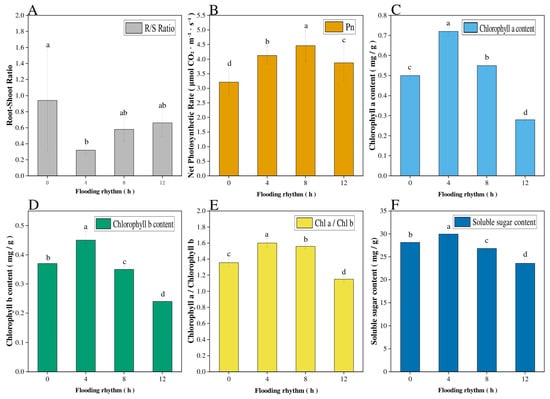 Effects of flooding rhythms on root–shoot ratio and physiological performance of S. hydrophyllacea seedling: (A) root–shoot ratio; (B) net photosynthetic rate; (C) chlorophyll a content; (D) Chlorophyll b content; (E) Chlorophyll a/b; (F) soluble sugar content. Different lowercase letters indicate significant differences at p < 0.05.
