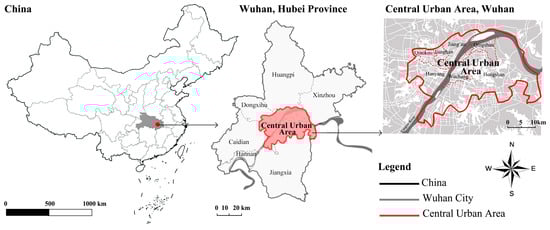 The research site is located in the Central Urban Area of Wuhan (30.52°–30.70° N, 114.25°–114.48° E), a megacity in central China, as shown in Figure 1. The Central Urban Area covers the spatial extent of seven core urban districts, characterized by the highest urbanization level and most pronounced urban heat island effects. Situated in the hinterland of the middle and lower Yangtze River basin, Wuhan experiences a humid northern subtropical monsoon climate with distinct seasonal variations. The multi-year average temperature ranges from 16.5 °C to 17.5 °C, featuring cold, dry winters with extreme lows below −10 °C during cold snaps, and hot, humid summers that average 28.7 °C but can reach 37–39 °C during heatwaves. Annual precipitation averages approximately 1100 mm, with over 40% concentrated in the rainy season from June to August, when flooding events are frequent. The regional vegetation is dominated by mixed evergreen and deciduous broad-leaved forest communities.