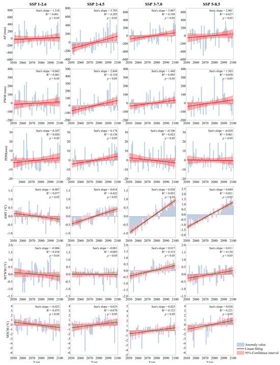 Interannual trends of projected hydrothermal variables in Wuhan under various emission scenarios in the distant future (2051–2100). AMT, annual mean temperature; MTWM, maximum temperature of the warmest month; MTCM, minimum temperature of the coldest month; AP, annual precipitation; PWM, precipitation of the wettest month; PDM, precipitation of the driest month. Corresponding trends for the baseline period (1981–2022) and the near future (2023–2050) are provided in Supplementary Figures S1 and S2, respectively.