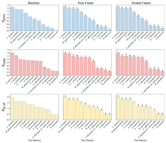 Interspecific variation in comprehensive climate risk values for baseline and future periods. Species labeled with different letters indicate statistically significant differences (p < 0.05). Rprec, Rtemp, and Rhy-th represent the comprehensive temperature, comprehensive precipitation, and comprehensive hydrothermal risk values, respectively.