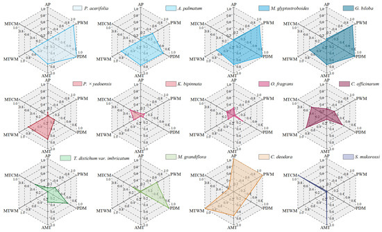 Moreover, climate risk hierarchies varied significantly among bioclimatic variables. During the baseline period, temperature risk patterns differed between species groups: for species with higher risks (M. glyptostroboides, P. acerifolia, G. biloba, A. palmatum, and P. × yedoensis), AMT and MTCM represented the highest and lowest risks, respectively, while the AMT risks reversed to be lowest in low-risk species (K. bipinnata, O. fragrans, C. officinarum, and M. grandiflora), as shown in Figure 4. Across precipitation variables, PDM and AP constituted the highest and lowest precipitation risk factors for 83.3% and 72% of the studied species, respectively, with PDM showing the overall highest risk values (0.58 ± 0.11) among all climatic variables.