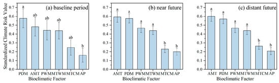 Variation in risk values among bioclimatic factors during three temporal periods: (a) baseline period (1981–2022), (b) near future (2023–2050), and (c) distant future (2051–2100). Different lowercase letters above bars indicate significant differences among groups as determined by one-way ANOVA followed by LSD post-hoc test at the p < 0.05 level.