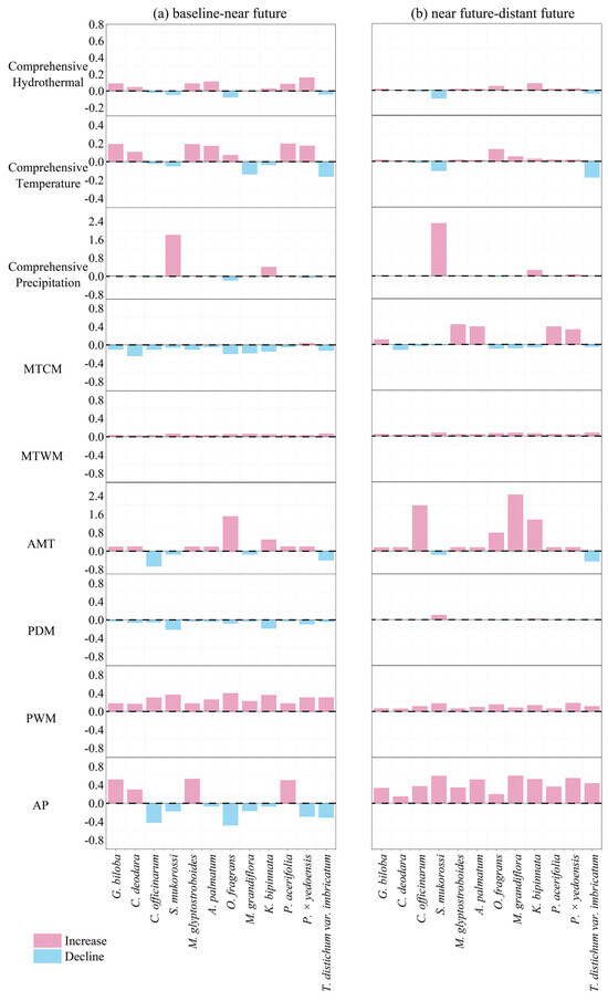 The species-specific risk growth rates for various bioclimatic variables during the (a) baseline–near future transition and (b) near future–distant future transition.