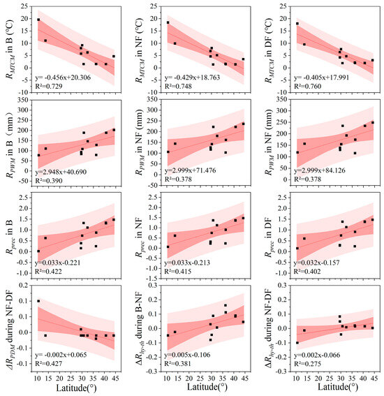 Linear regression between the latitudes of species’ distribution centroids and their climate risk parameters, showing significant correlations. B, NF, and DF represent the baseline period, the near future, and the distant future, respectively. RMTCM, RPWM, and Rprec represent the MTCM, PWM, and comprehensive precipitation risk value, respectively, while ΔRPDM and ΔRhy-th represent the PDM and comprehensive hydrothermal risk growth rate, respectively.