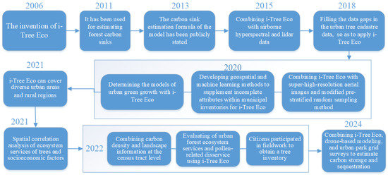 The i-Tree Eco model was developed in the early 21st century and has become widely referenced in urban carbon sink research. The i-Tree Eco [25] model (we used the i-Tree Eco v6.0.32 in this study) is a flexible software application that was developed by the Forest Service of the United States Department of Agriculture in 2006 [26]. It uses data collected from individual trees, complete forest inventories, and sample plots to quantify the forest structure, environmental effects, and ecosystem service values [27]. Information on tree species, tree morphological characteristics, air pollution, and meteorological data is required. In this study, the ecosystem service value included carbon storage and sequestration as two carbon sink indicators. The i-Tree series has grown to cover trees in diverse settings such as urban areas and rural regions [28] and has been validated by many case studies worldwide [29]. In urban research, scholars use i-Tree Eco to determine the models of urban green growth [30]; evaluate one particular ecosystem service, like carbon storage [29] or air quality improvement [31]; estimate the ecosystem services provided by urban parks [32]; or compare different urban green designs concerning ecosystem service provision [33]. The timeline of the development of i-Tree Eco for carbon sink estimation is as shown in Figure 1.