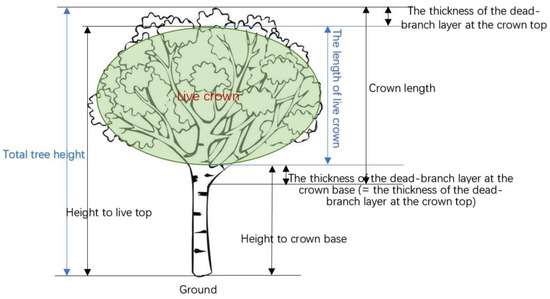 The value 39.6 in Equation (A6) originates from the average “percent crown missing” of unpruned trees reported in [44]. Here, we assumed that the average “percent crown missing” of 39.6 for unpruned trees was the standard reference for healthy trees. Since this is the only study, both in China and internationally, that has published empirical data on percent crown missing, we currently rely on this Massachusetts-based data as the standard value.