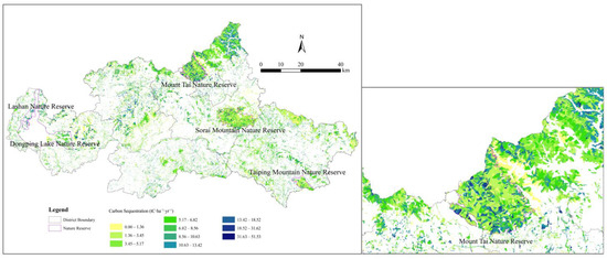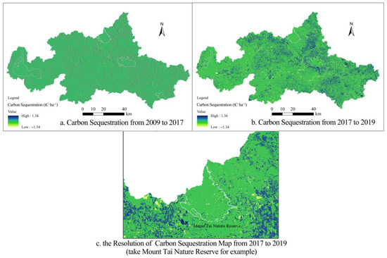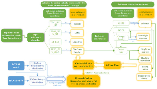 To tackle these challenges, this study integrates China’s Forest Resources Inventory database into i-Tree Eco through indicator conversion, enabling citywide (a type of small-scale) carbon sink mapping in Tai’an (a National Forest City in China). The i-Tree Eco model was accessed at https://www.itreetools.org/i-tree-tools-download (accessed on 1 May 2023). Additionally, our improved estimation process is easily applicable and low-cost, leading to results with a high spatial resolution. This way, to a certain extent, the drawback of high data acquisition costs in the i-Tree Eco model has been overcome.