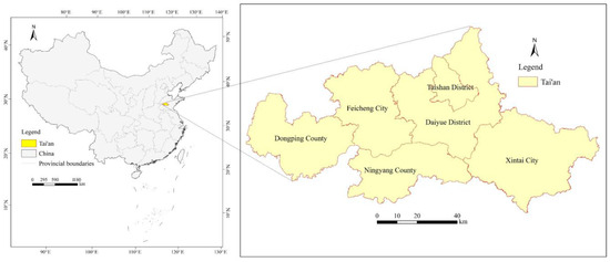 Tai’an City is located in Shandong Province, China, covering an area of 7762 km2. Its location is shown in Figure 4. Tai’an had a population of 5,635,000 in 2019; it is rich in forest resources and is known as China’s “National Forest City”. By the end of 2020, Tai’an City’s forest area was 200,316 ha, the forest coverage was 25.81%, and the total standing stock volume of living trees was 10.81 million m3. Tai’an City had 1189.80 ha of new afforestation between 2021 and 2022 [48]. The forest resource inventory and land use data of Tai’an meet the needs of carbon sink research. Therefore, Tai’an was selected as the study area. The carbon sink function of the forest should be significant, the total carbon sink and carbon density in the municipality should be relatively high, and the spatial heterogeneity of carbon sinks should be evident. The capability of different models to demonstrate the spatial heterogeneity of carbon sinks was tested using this area as a case study.