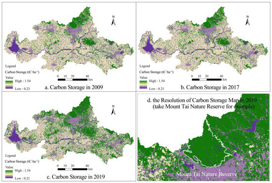 All land use types in our data sources corresponded to the six land use types in the InVEST model—cropland, woodland, grassland, water area, built-up land, and unused land. These categories were used to obtain the three-phase LULC data of Tai’an in 2009, 2017, and 2019. The LULC data were input into the InVEST 3.13.0-workbench software to estimate carbon sinks. The resolution of the LC data used is approximately 350 m × 350 m.