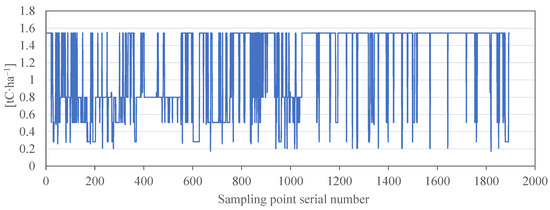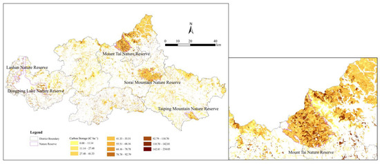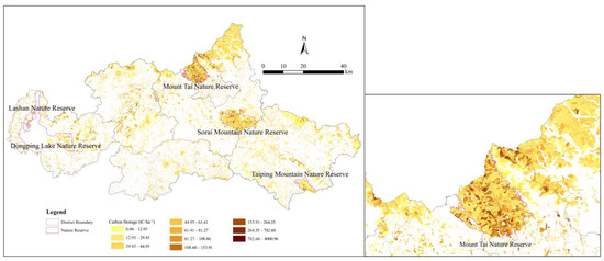 Carbon pool values are input parameters that are required by the InVEST model. The carbon pool values represent the carbon content of each hectare of various types of land, including the carbon in the above-ground part, the carbon in the below-ground part, soil carbon, and carbon in dead organic matter. The carbon pool values in this study were adopted from the average of the carbon pool values in Shandong Province and the neighboring provinces of Shandong (the data are from previous studies, as shown in Appendix B). Shandong Province is where our study area Tai’an is located. We input Table 6 into the InVEST model to derive the carbon storage and carbon sequestration distributions for Tai’an (Table 6; see Appendix B for the derivation process).