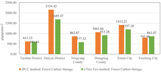 Carbon sinks are of great significance for mitigating the greenhouse effect and climate change. However, only a few carbon sink measurement methods are suitable for small-scale research, such as at the city-region scale. Methods that can accurately distinguish the high–low gradients of forest carbon sinks within small-scale areas have not yet been established. To fill this gap, we used a tree allometric growth model—the i-Tree Eco model—and applied it to Tai’an, which is a National Forest City in China. By using indicator conversion methods, we innovatively combined the China Forest Resources Inventory Geographic Information Database with i-Tree Eco. The results showed that i-Tree Eco successfully estimated the carbon sinks provided by urban–rural forests (in 2019)—the total carbon storage in Tai’an forest was 5,828,165.90 t; the average carbon storage per hectare was 37.19 tC·ha−1; the total carbon sequestration was 936,789.03 tC·yr−1; and the annual carbon sequestration was, on average, 5.97 tC·ha−1·yr−1. Our method improved the spatial resolution of carbon sequestration and storage compared to the commonly used InVEST model, from about 350 m × 350 m to 195 m × 195 m. Compared to the traditional IPCC method, the i-Tree Eco model provided greater accuracy and timeliness in small-scale carbon sequestration measurements, eliminating the need to wait for the next forest inventory to be published. Our method yielded results that covered the entire city region and better reflected the spatial heterogeneity of carbon sinks. We conclude that the innovative application of the i-Tree Eco model to urban–rural-scale carbon sink measurements provides stronger technical support for urban green space planning, as well as data guidance, in relation to local carbon mitigation strategies.