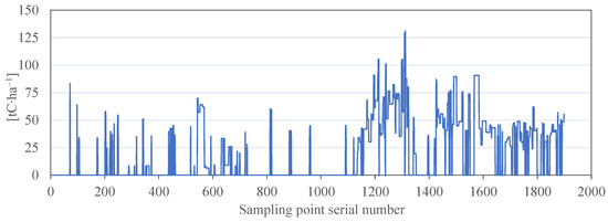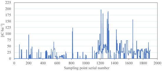 In addition, i-Tree Eco (complete inventory mode) can be used as a carbon sink calculation method for a single tree. However, each item in the Tai’an Forest Resources Inventory database represents a woodland patch in which each tree species is located, providing indicators, such as tree species, average tree height, average DBH, and the overall crown health condition of the woodland patch. Therefore, the “number of trees per hectare” index BCZS and the woodland patch area in the Tai’an Forest Resources Inventory database were used to convert the carbon sink of a single tree evaluated using i-Tree Eco into the total carbon sink of all trees in that woodland patch. The total carbon sink was derived from the average carbon sink per tree. The formula is as follows: