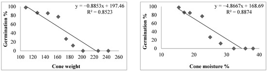The regression equation and coefficient of determination showed a negative significant relationship between cone weight, cone moisture percent, and seed moisture contents with seed germination percentage, while the seed weight showed a positive relationship with the seed germination of C. deodara (Figure 5).