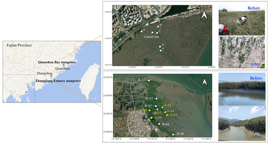 The location of the sampling sites. The sites labeled “B-” and “A-” in the Zhangjiang Estuary represent the sampling sites before and after the removal of S. alterniflora, respectively, with B-A5 and A-A6 located in the same location.