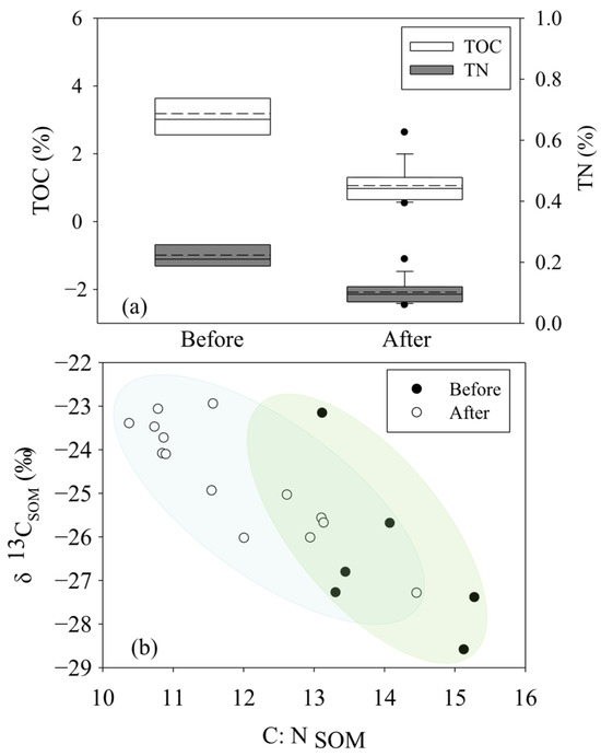 Before the removal of S. alterniflora, the contents of TOC and TN in the ZJE mangrove forest were in the ranges of 2.52%~4.71% (3.19 ± 0.81%, n = 6) and 0.18%~0.31% (0.23 ± 0.05%, n = 6), which decreased to 0.54%~2.63% (1.06 ± 0.53%, n = 14) and 0.06%~0.21% (0.10 ± 0.04%, n = 14) after the removal of S. alterniflora (Figure 2a). Generally, higher contents of both TOC and TN were observed in the core area of the mangrove community. Following the trend of the variation in the TOC and TN, the C:N ratio of the soil (C:NSOM) in the ZJE mangrove forest decreased from 13.12~15.28 (14.09 ± 0.95%, n = 6) to 8.39~12.39 (10.16 ± 1.05%, n = 14) (Figure 2b), with the maximum values observed in the core area of the ZJE mangrove forest during both sampling periods (Table S1). In comparison, the observed δ13CSOM values showed relatively less temporal variation (Figure 2b), being in the ranges of −28.6‰~−23.2‰ (−26.5 ± 1.8‰, n = 6) and −27.29‰~−22.95‰ (−24.67 ± 1.32 ‰, n = 14) before and after the removal of S. alterniflora, respectively (Figure 2b). The variation in the TOC, TN and C:NSOM in the QZB mangrove forest was described in our previous research [7]. Briefly, the contents of TOC and TN and the δ13CSOM both decreased obviously after the removal of S. alterniflora, while the C:N ratio of the SOM increased obviously. In comparison, the contents of TOC and TN in the ZJE were obviously higher than those in the QZB mangrove forest, while the C:NSOM here was lower. The data for the QZB mangrove forest are also shown in Table S2.