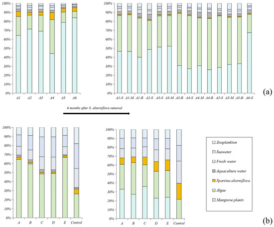 The proportion of the organic matter derived from different sources is shown in Figure 3: (1) Before the removal of S. alterniflora, S. alterniflora contributed to 5.2 ± 2.2% (n = 6) and 2.5 ± 1.5% (n = 6) of the total SOM in the ZJE and QZB mangrove forests. Mangrove plants were the primary source of the SOM in the ZJE mangrove forest (68.4 ± 14.3%, n = 6), while algae (including benthic algae and phytoplankton) were the main source in the QZB mangrove forest (53.6 ± 16.2%, n = 6). (2) At 6 months after the removal of S. alterniflora, its contribution had decreased to 1.0 ± 0.2% (n = 11) in the ZJE mangrove forest, whereas that in the QZB mangrove forest had increased to 10.6 ± 4.2% (n = 6). Algae became another significant source of the SOM in the ZJE mangrove forest, accounting for 64.6 ± 20.5% (n = 11) of the total SOM, while the contribution of algae in the QZB mangrove forest was relatively lower (28.2 ± 4.8%, n = 6). Generally, the indicators of S. alterniflora in the QZB mangrove forest increased rapidly during our investigation (t = −6.21, p = 0.002). This was not observed in the ZJE mangrove forest.