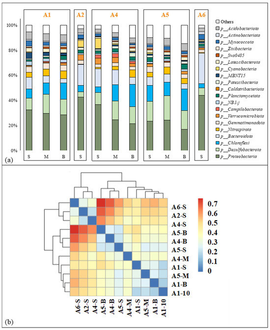 Composition of benthic microbial community in Zhangjiang Estuary mangrove forest: (a) microbial composition at phylum level, (b) results of cluster analysis. “-S”, “-M” and “-B” represent samples collected from the surface 10 cm, 20~25 cm and 40~45 cm respectively.