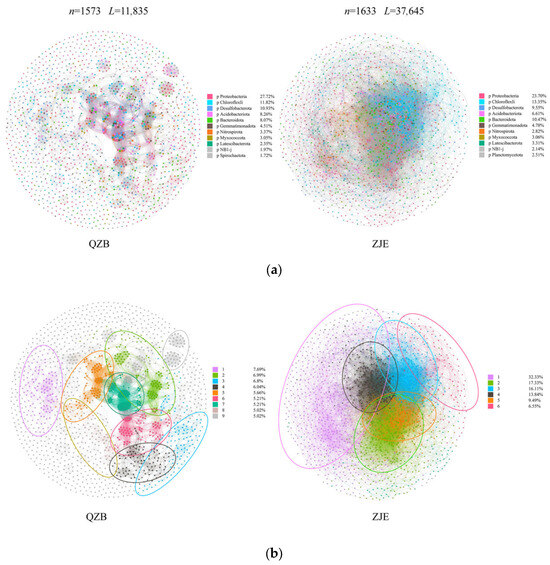 The microbial co-occurrence networks in the Quanzhou Bay mangrove forest (QZB) and Zhangjiang Estuary mangrove forest (ZJE): (a) the phyla of the major components in the networks and (b) the modularity of the networks’ construction.