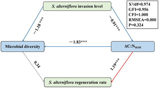 The structural equation model (SEM) indicating the effects of the S. alterniflora invasion level pre-restoration, microbial diversity and variation in the C:NSOM on the regeneration rate of S. alterniflora. Path coefficients only include significant standardized prediction coefficients. Red and blue arrows indicate positive and negative relationships, respectively. Continuous arrows show significant associations (*** p < 0.001). Dotted arrows show non-significant associations.