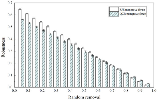 The robustness indices in the Zhangjiang Estuary (ZJE) mangrove forest and Quanzhou Bay (QZB) mangrove forest (with the X-axis representing the percentage of species lost).